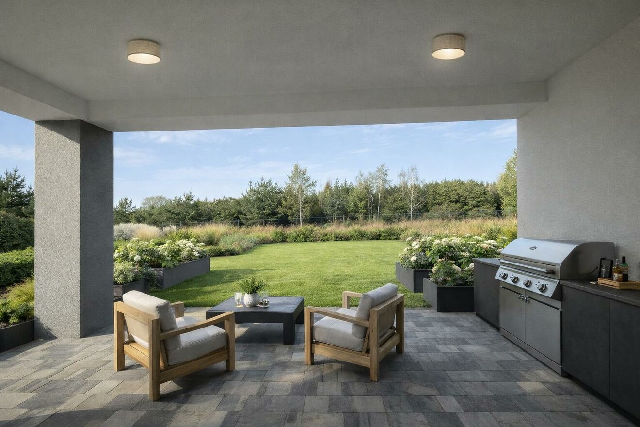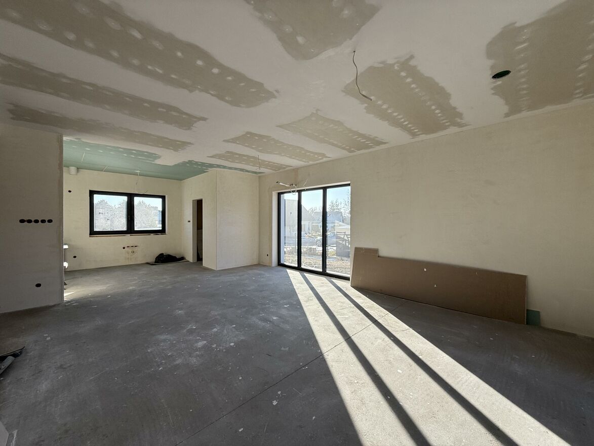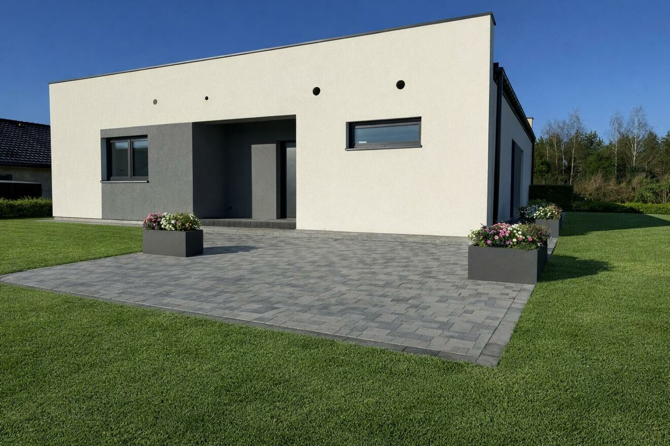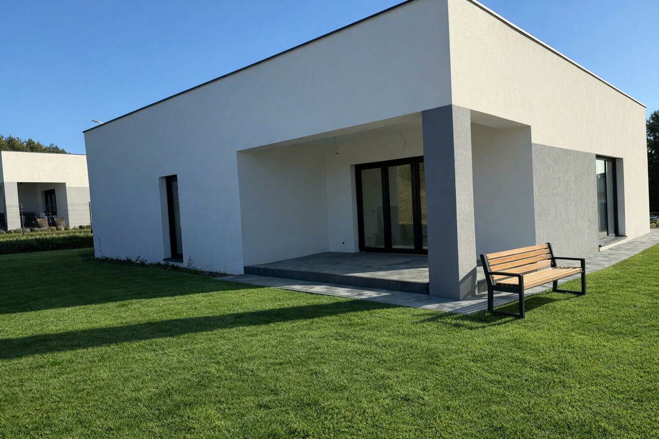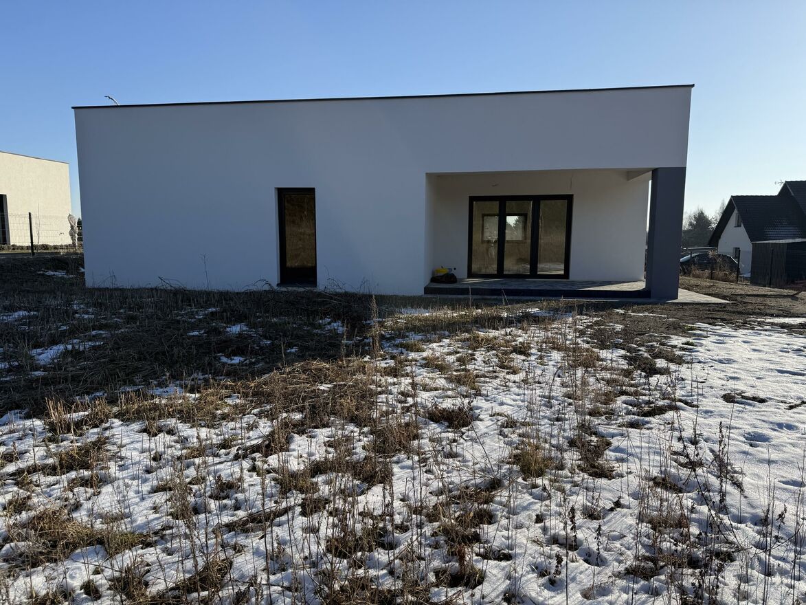 Nowoczesny budynek z płaskim dachem, gotowy do wykończenia.